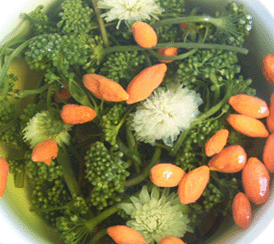 3、人参花配老姜6片、胡萝卜1个(切片)、蜂蜜适量 功效:哮喘、支气管炎。